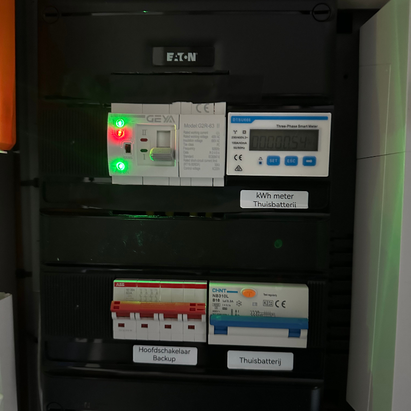18 Zonnepanelen, SolarEdge omvormer, 22 kWh/dag. Thuisbatterij geïnstalleerd in garage samen met Backup op 16A groepen.