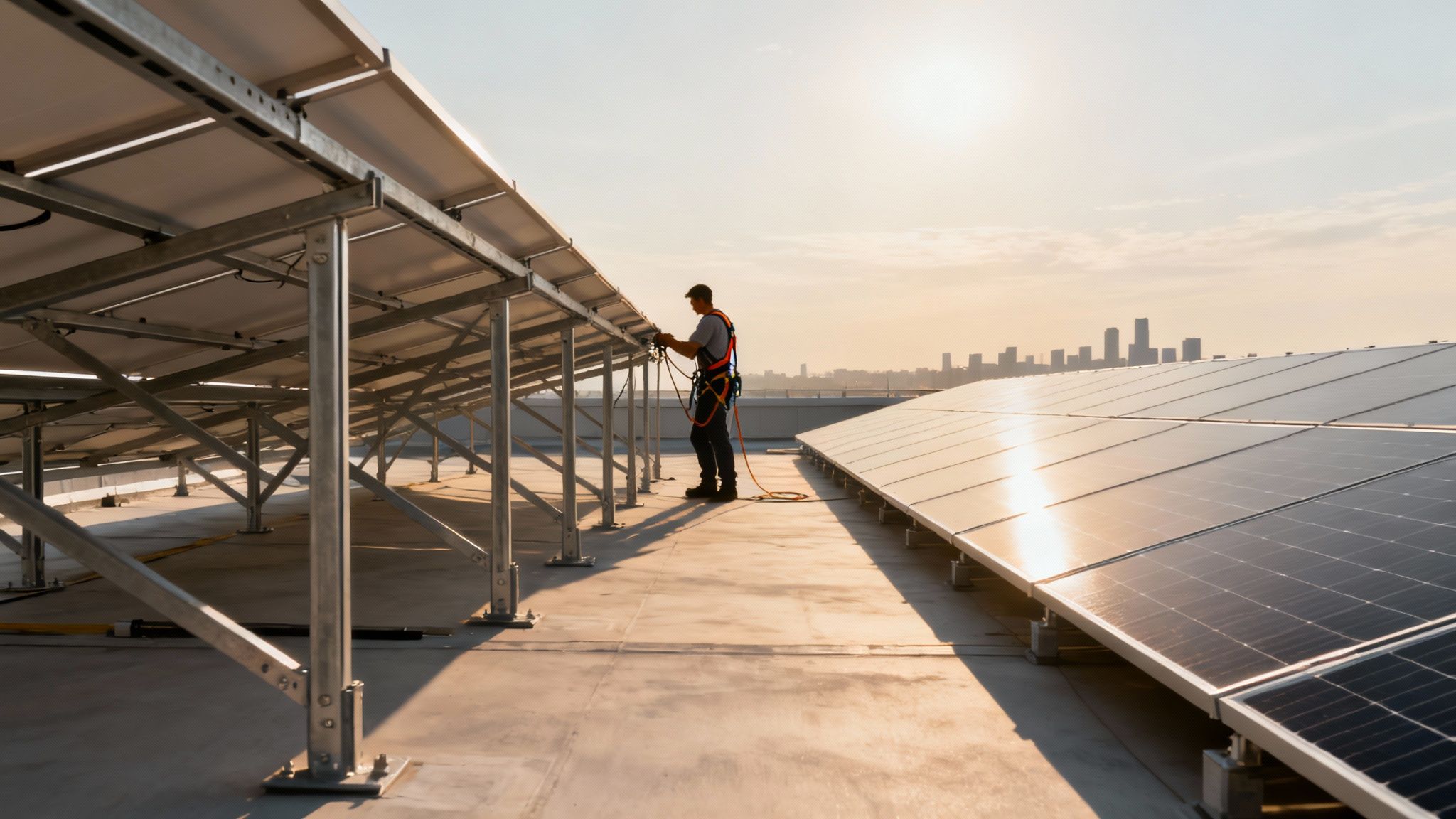 Is je dakbedekking nog in topconditie? En misschien nog wel belangrijker: hoe zit het met de draagkracht van de constructie? Je dak moet niet alleen het gewicht van de zonnepanelen zelf aankunnen, maar ook de ballast die nodig is om alles stevig op zijn plek te houden. Reken op zo’n 20 tot 30 kg per vierkante meter extra gewicht.